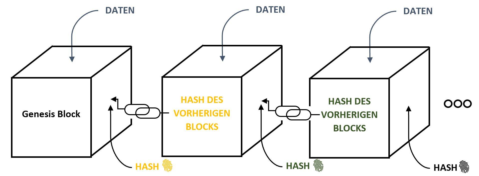 Kryptographie: Die in einer Blockchain enthaltenen Daten werden mithilfe kryptographischer Algorithmen gesichert. Jeder Block enthält einen Hash-Wert, der den Inhalt des Vorgängers und die darin enthaltene Transaktion eindeutig repräsentiert.