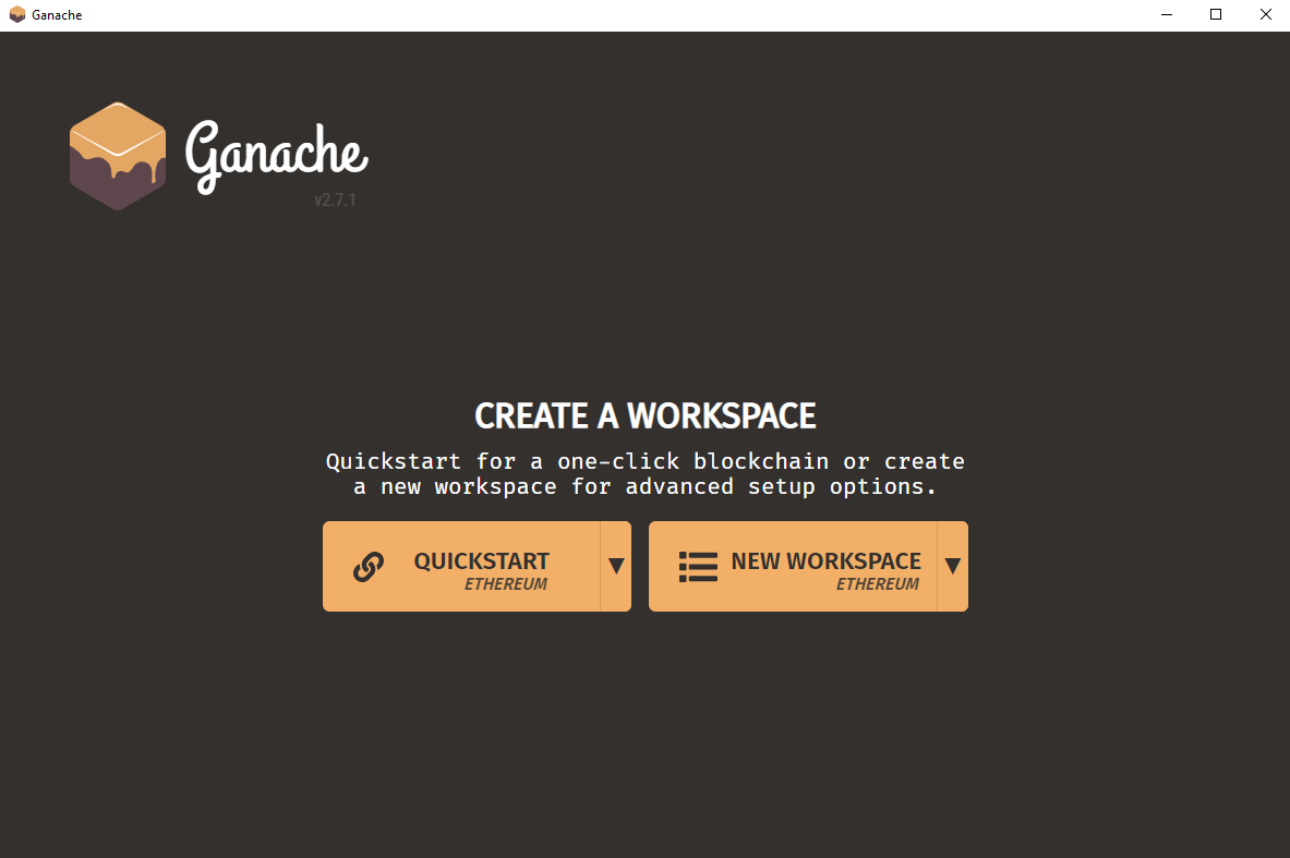 Hierzu die Ganache Anwendung öffnen und per Quickstart eine Ethereum Blockchain erstellen: