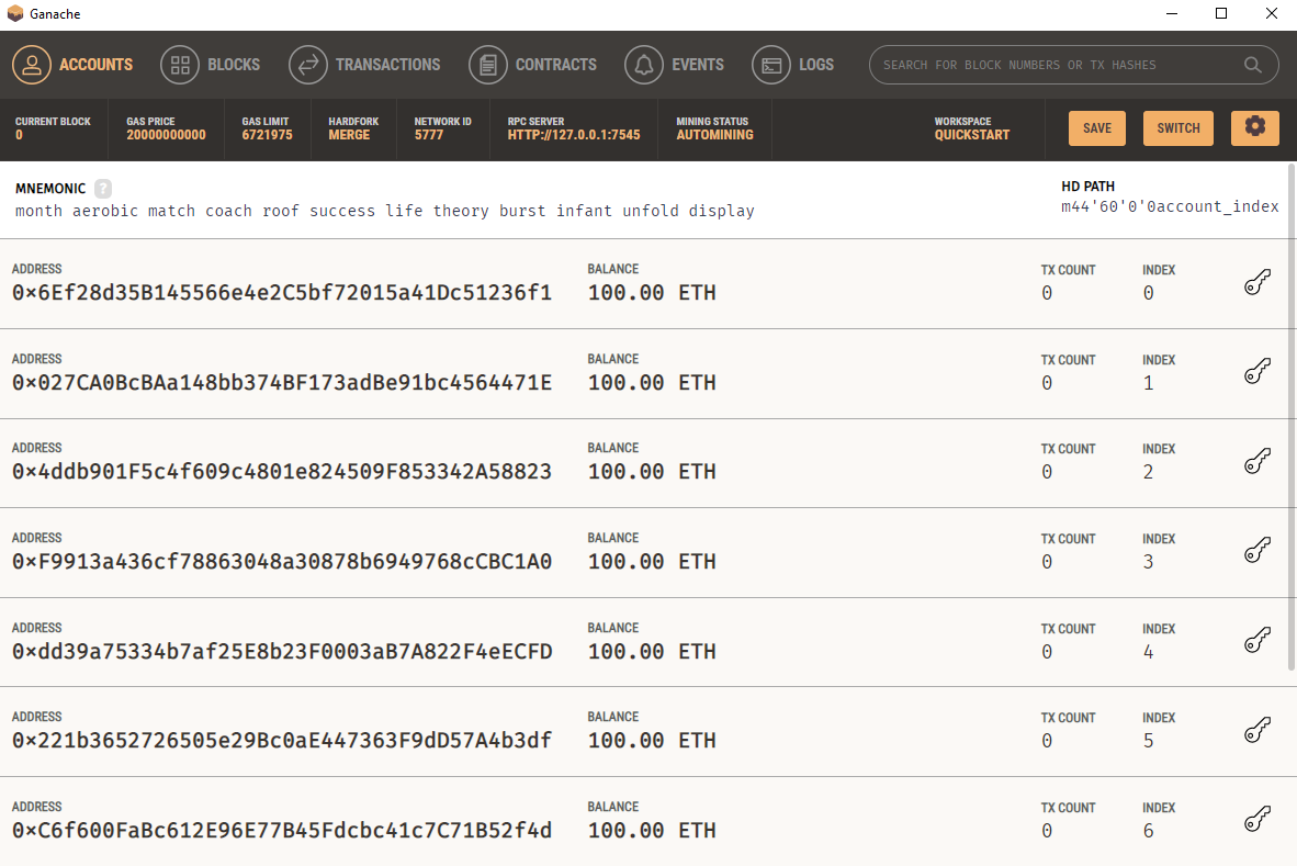 Anschließen sieht man die Accounts Seite von Ganache mit 10 Wallet Adressen, die jeweils 100 ETH Guthaben besitzen: