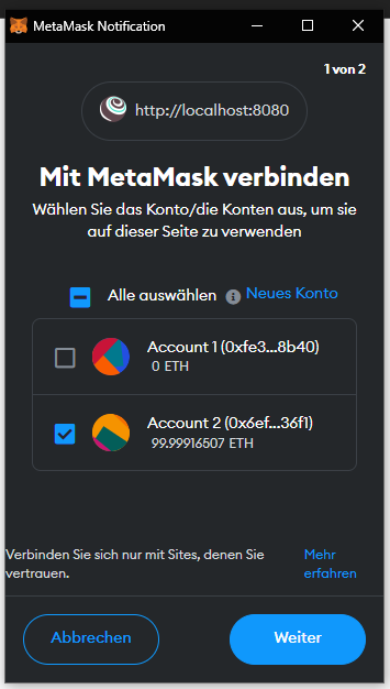 Beim ersten Öffnen werden wir direkt von MetaMask unterbrochen, um unser Wallet auszuwählen, mit dem wir mit dem Smart Contract interagieren wollen: