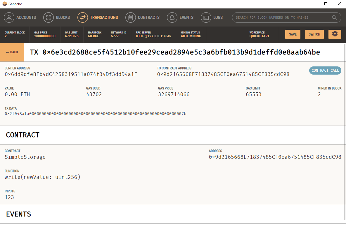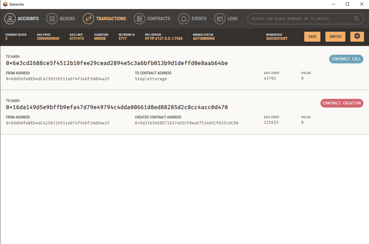 Jede schreibende Operation erstellt eine Transaktion auf der Blockchain. Folgene Transaktion haben wir bis jetzt durch unseren Versuch ausgeführt: