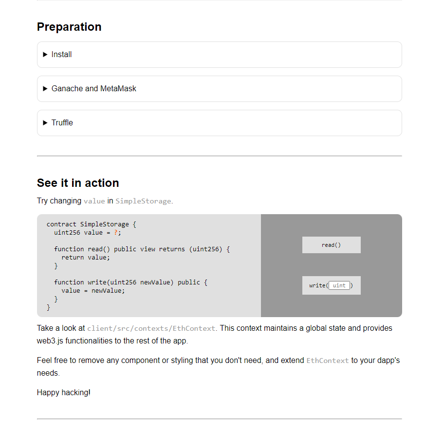 Sobald wir verbunden sind, sehen wir die Webanwendung, welche zunächst einen kurzen Überblick über Einrichtungsschritte zu Truffle und Ganache gibt und uns weiter unten die Möglichkeit bietet, mit unserem Smart Contract zu interagieren.