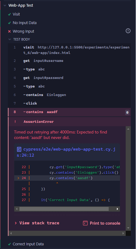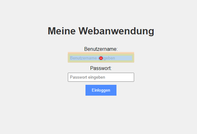 Zunächst braucht man eine Website, die man testet. Dafür haben wir eine kleine Anmeldemaske gebaut, die überprüft, ob die Anmeldedaten stimmen, und demensprechend eine Meldung ausgibt: