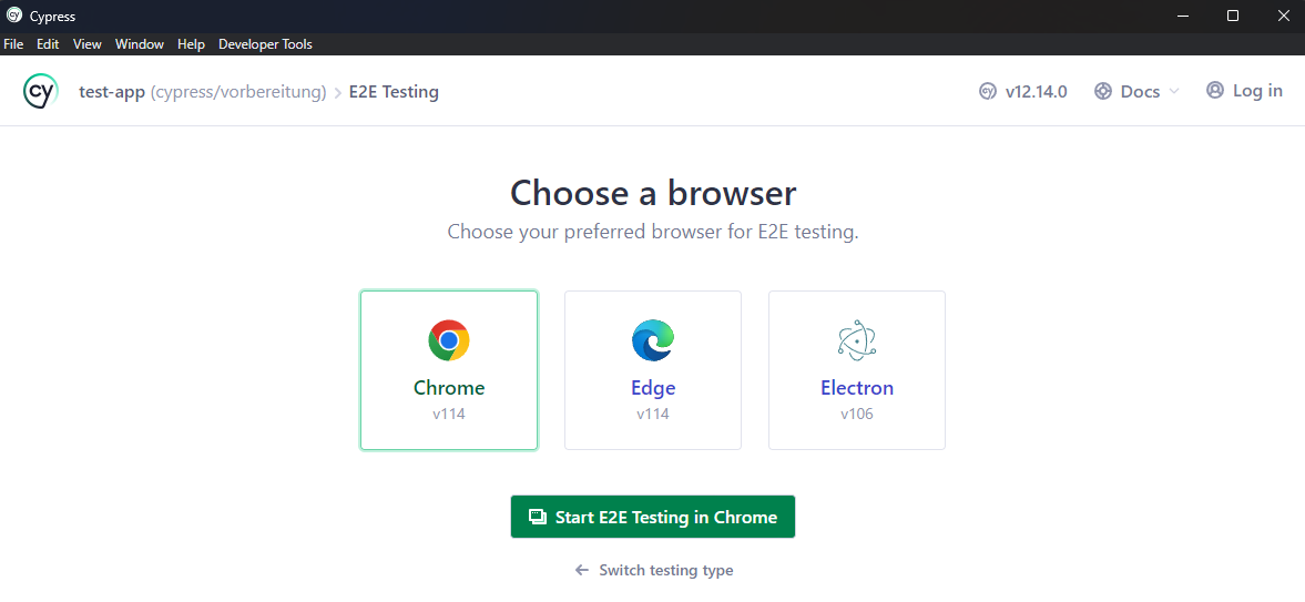 Cypress unterstützt für die DevTools Chrome, Edge und Electron. Nach dem Auswählen des gewünschten Browsers kann man nun mit dem Schreiben oder Aufzeichnen der Tests beginnen.